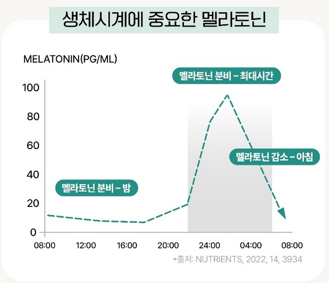 여기서 이야기하고 있는 "멜라토닌"이란 일종의 수면호르몬으로써 생체리듬을 조절하고 신체가 자연스럽게 휴식을 취할 수 있도록 도움을 준다고 합니다. 특히 어두운 저녁에 상승하고 빛이 증가하는 아침에 감소하는 것으로 알려져 있는데요. 제가 잠을 청하는 오전시간 대에는 하루 24시간 중 멜라토닌 분비가 가장 적게 일어나는 시기이기도 하여 수면의 질이 떨어질 수 밖에 없고, 그렇게 휴식을 취하고 나서도 무언가 충전이 되었고 개운하다는 느낌을 받지 못했던 것도 멜라토닌의 부족으로 인한 영향이 아니었을까 하는 생각을 해봅니다.